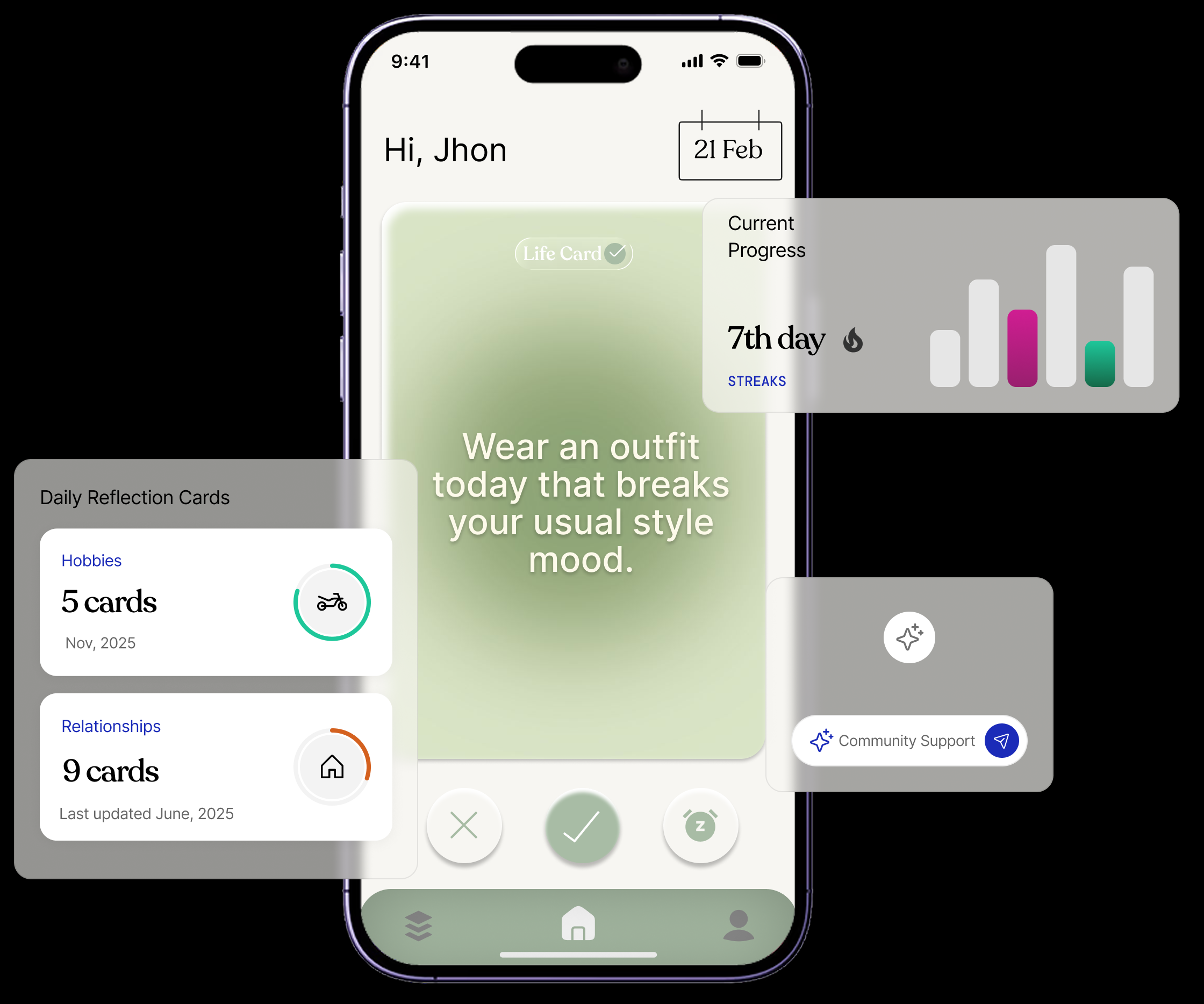 A small, intentional daily ritual. A social ritual and a workshop ritual carefully designed for you at regular intervals. And periodic reflections that show you how you're changing over time. No feeds. No noise. No pressure to perform.